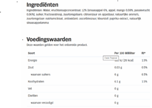 Hierboven staan de ingrediënten en de hoeveelheid koolhydraten van een fruitsap Oasis genaamd. Per 100 ml zitten er 2 klontjes suiker in en extra fructosestroop aan toegevoegd… Dus mensen, lees de achterkant van een verpakking en zet het pak terug als je dit leest…